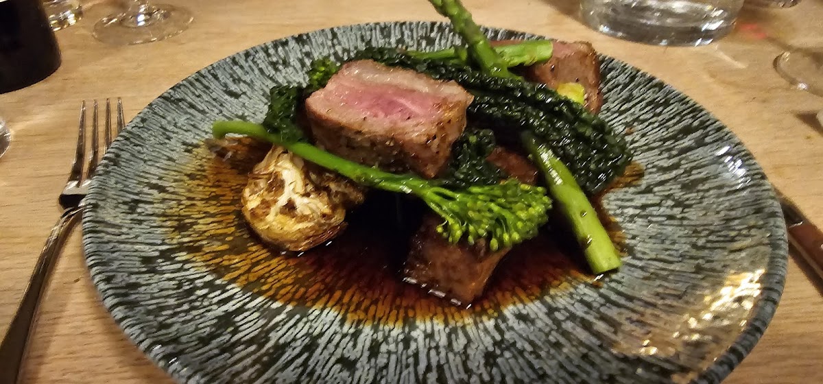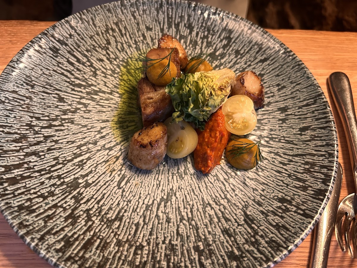 “The restaurant is on the lower ground floor but we got a seat next to the windows so we had natural sunlight. For the starter I had wasabi cured salmon and my partner had pan seared scallops with hog pudding. Both were well presented. the salmon was lightly cured and orange worked surprisingly well with it. I guess it is still in the citrus family but a bit sweeter than lemon. I didn’t know what hog pudding was but was meaty and juicy and combined well with the sweetness of the scallops.”